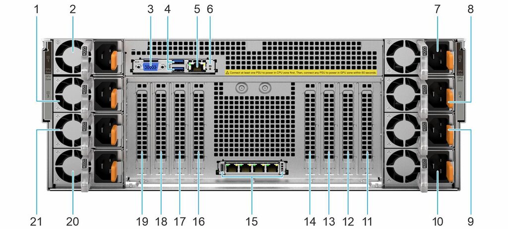 | 1.システムのPSU3 2.システムのPSU1 3.ディスプレイ デバイスをシステムに接続できます。 4.USB ポートは9 ピンで、3.1 準拠です。このポートによってUSB デバイスをシステムに接続できます。 5.iDRAC にリモート アクセスできます。 6.システム識別(ID)機能は、システムの前面と背面にあります。前面パネルにはボタン、背面パネルにはLED があります。 7.システムのPSU2 8.システムのPSU4 9.システムのPSU6 10.システムのPSU8 | 11.PCIe スロット9 12.PCIe スロット8 13.PCIe スロット7 14.PCIe スロット6 15.OCP NICカードはOCP 3.0をサポートしています。 16.PCIe スロット4 17.PCIe スロット3 18.PCIe スロット2 19.PCIe スロット1 20.システムのPSU7 21.システムのPSU5 |